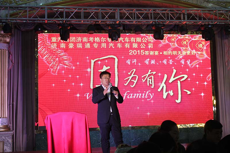 時(shí)光飛逝,歲月如梭,轉(zhuǎn)眼間忙碌的2015年已過去,充滿期待的2016年正向我們走來。新的一年,孕育新的目標(biāo)和希望,重汽集團(tuán)濟(jì)南考格爾專用汽車有限公司2015年度答謝宴于2015年12月17日晚在濟(jì)南皇宮大酒店舉行。來自五湖四海的經(jīng)銷商朋友歡聚一堂,其樂融融。