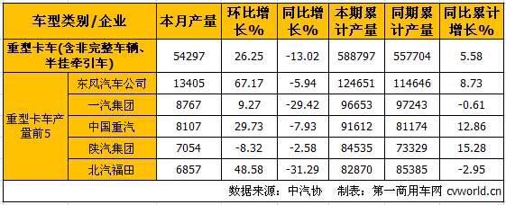 9月份重型卡車(chē)(含非完整車(chē)輛、半掛牽引車(chē))產(chǎn)量前5的企業(yè)依次為:東風(fēng)汽車(chē)公司(13405輛)、一汽集團(tuán)(8767輛)、中國(guó)重汽(8107輛)、陜汽集團(tuán)(7054輛)和北汽福田(6857輛),5家合計(jì)生產(chǎn)44190輛,占重型卡車(chē)(含非完整車(chē)輛、半掛牽引車(chē))9月總產(chǎn)量54297輛的81.39%。