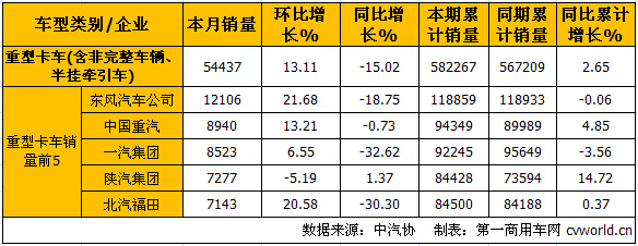 9月份重型卡車(chē)(含非完整車(chē)輛、半掛牽引車(chē))銷(xiāo)量前5的企業(yè)依次為:東風(fēng)汽車(chē)公司(12106輛)、中國(guó)重汽(8940輛)、一汽集團(tuán)(8523輛)、陜汽集團(tuán)(7277)和北汽福田(7143輛),5家合計(jì)銷(xiāo)售43989輛,占重型卡車(chē)(含非完整車(chē)輛、半掛牽引車(chē))9月總銷(xiāo)量54437輛的80.81%。