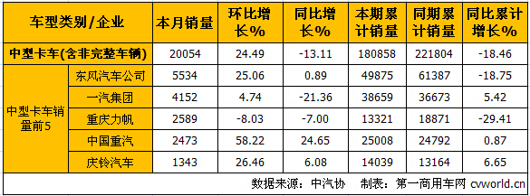 9月份中型卡車(chē)(含非完整車(chē)輛)銷(xiāo)量前5的企業(yè)依次為:東風(fēng)汽車(chē)公司(5534輛)、一汽集團(tuán)(4152輛)、重慶力帆(2589輛)、中國(guó)重汽(2473輛)和慶鈴汽車(chē)(1343輛),5家合計(jì)銷(xiāo)售16091輛,占中型卡車(chē)(含非完整車(chē)輛)總銷(xiāo)量20054輛的80.24%。